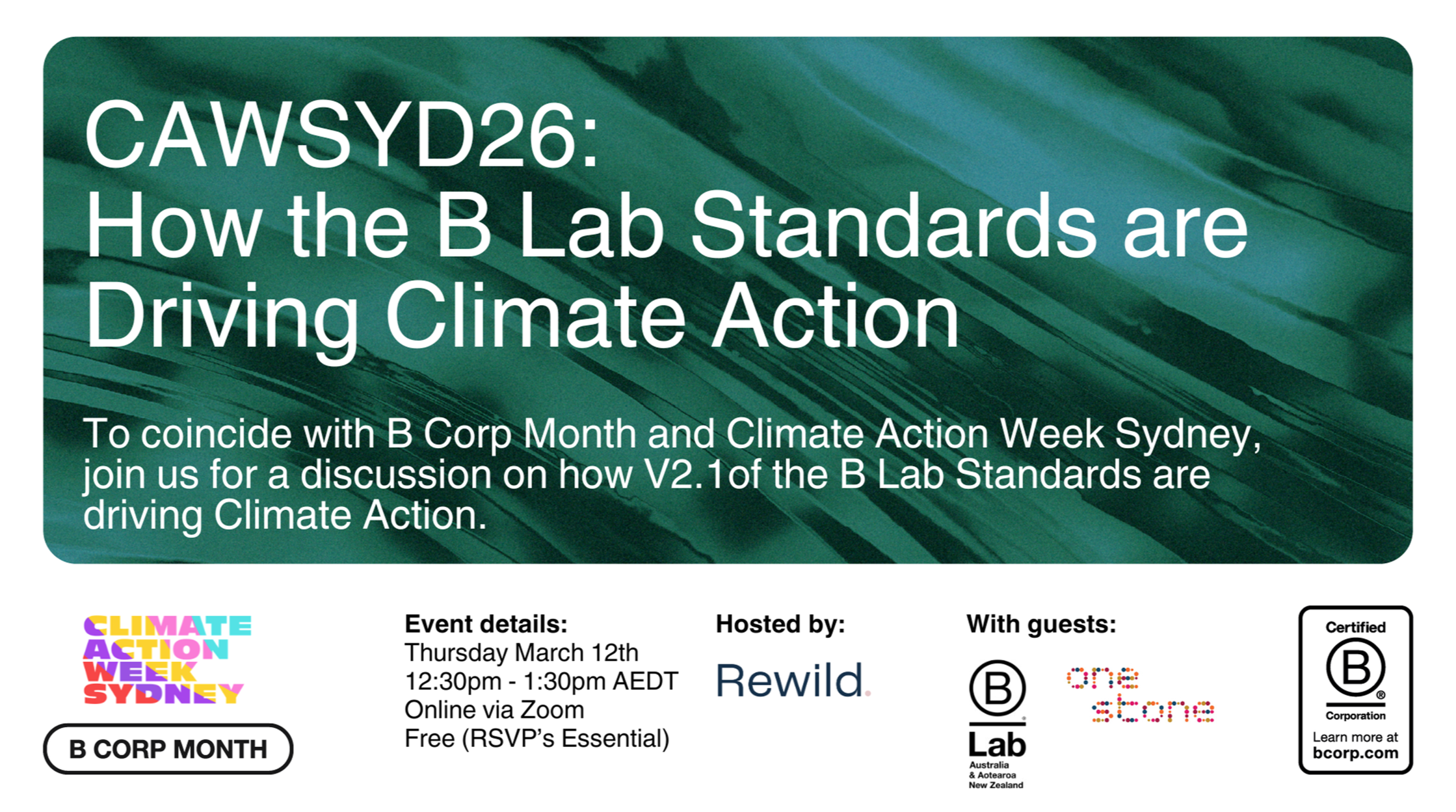 Guest speakers include B Lab AANZ and Andrea Spencer-Cooke, CEO/Principal of One Stone Advisors (Sydney-based B Corp and fellow B Consultant).