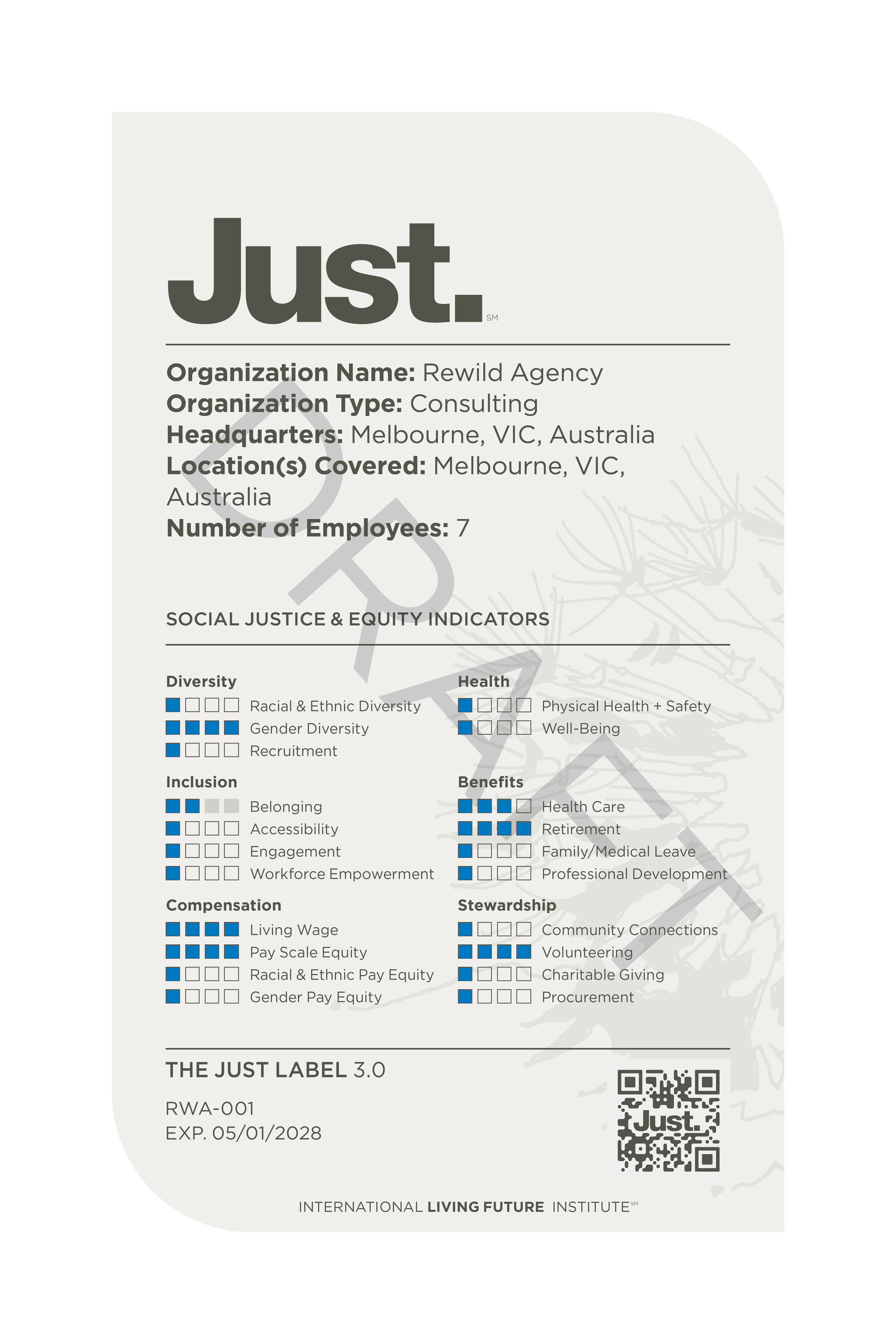 JUST is a voluntary disclosure tool developed by the International Living Future Institute. It functions similarly to a ‘nutrition label’ for organisations, providing a clear and accessible summary of policies and performance across key social and governance indicators. These include areas such as: